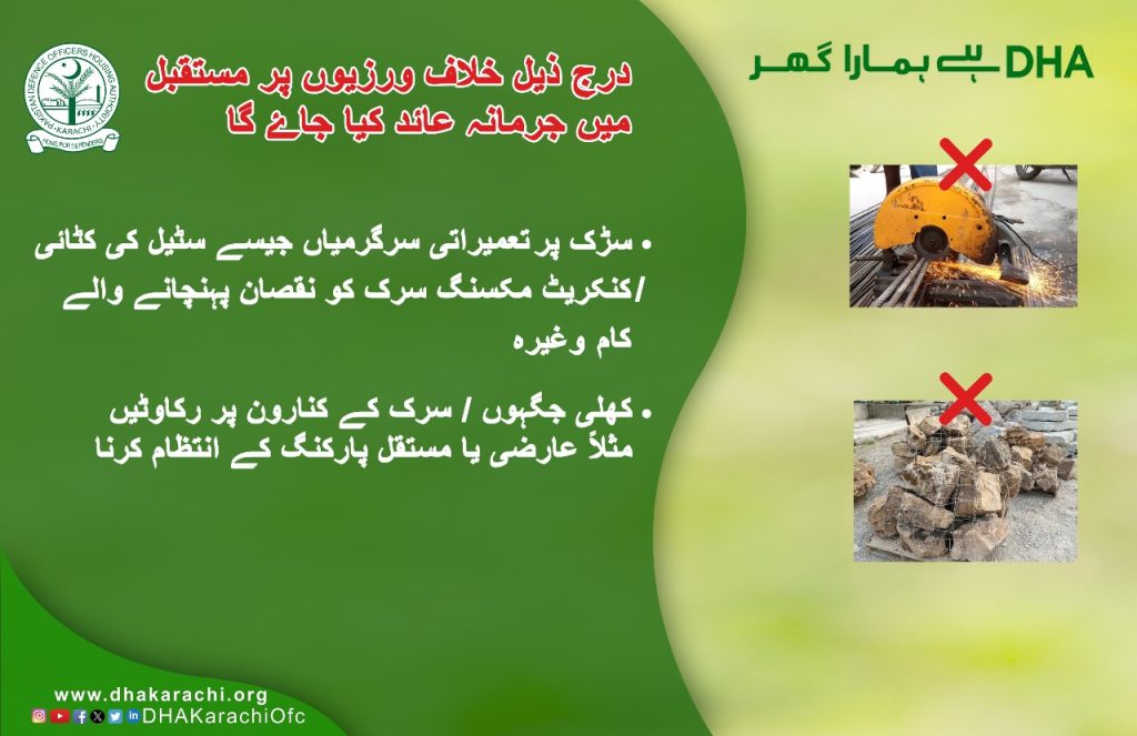ڈی ایچ اے کراچی کے رہائشیوں سے گزارش ہے کہ ڈی ایچ اے کے ضمنی قوانین پر عمل کریں۔ قوانین کی خلاف ورزی پر جرمانہ عائد کیا جائے گا۔ براہ کرم ہر ایک کے لیے ایک صاف، محفوظ، اور ہم آہنگ ماحول کو برقرار