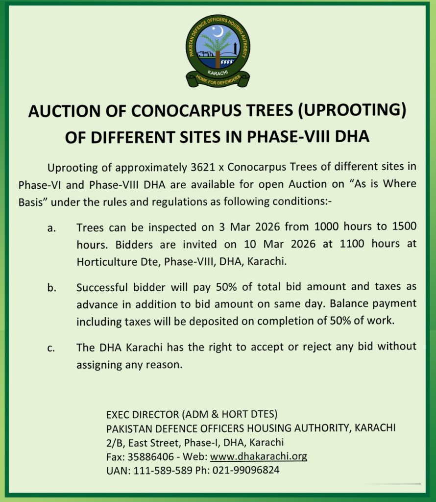 Tenders Auction of Conocarpus Trees (Uprooting) of Different Sites in Phase VIII DHA