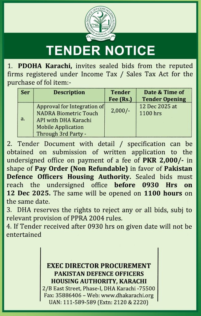 Tender Notice – Approval for Integration of Nadra Biometric