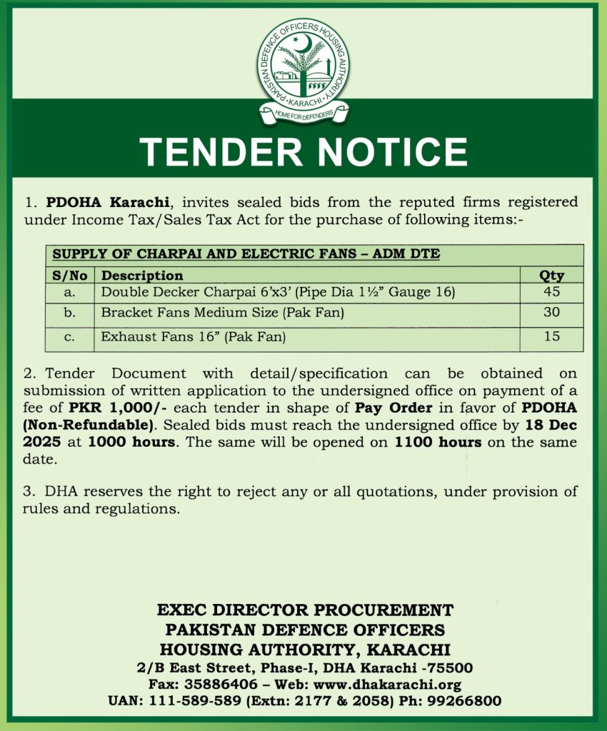 Tender Notice – Charpai and Electric Fans