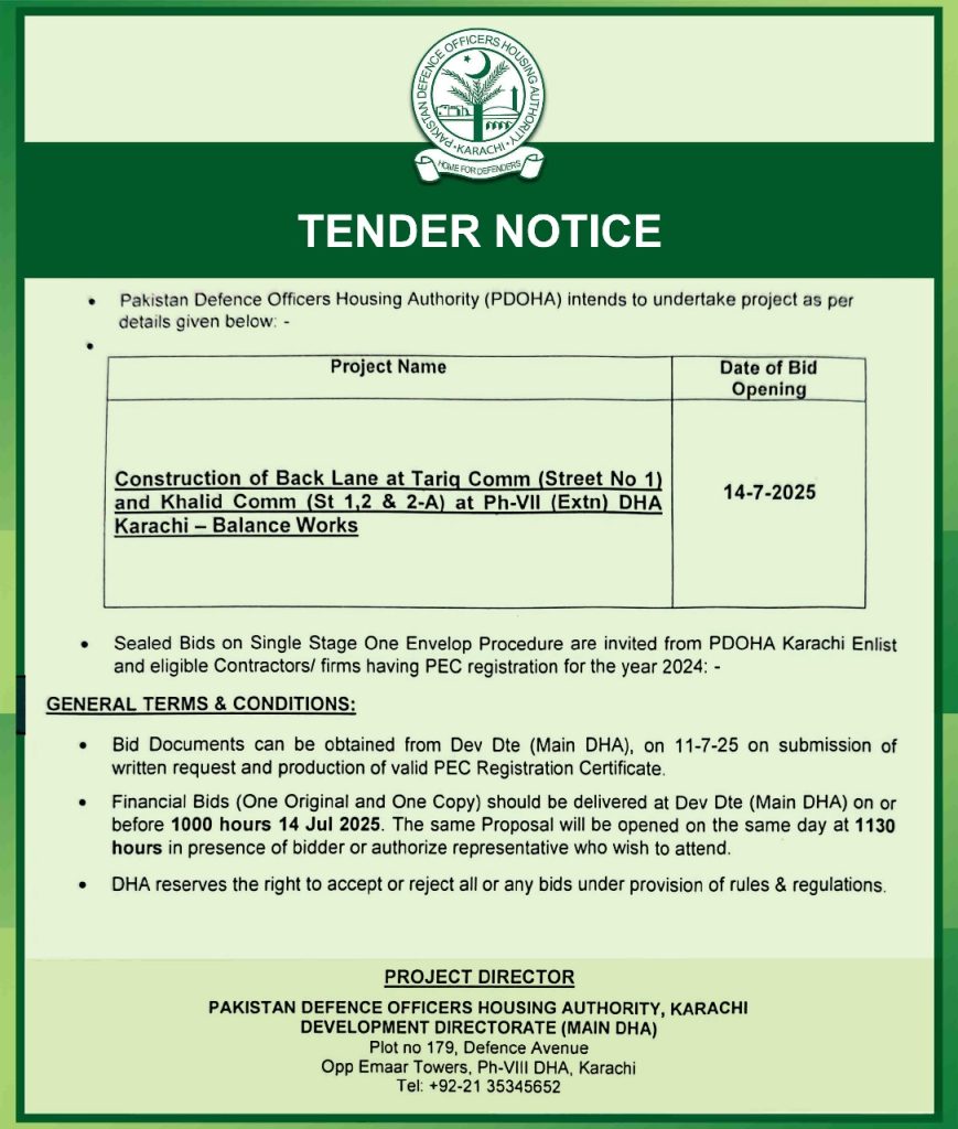 Tender Notice – Construction of Back Lane at Tariq Commercial & Khalid Commercial at Phase VII (Extn)