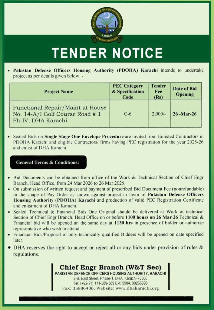 Tenders Tender Notice – Functional Repair / Maint at House 14-A/I Golf Course Road